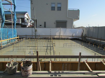 ・コンクリートは養生期間(固まる時間)がかかるので、今日はここで作業終了です。次の作業は、立ち上がり部分の型枠工事になります。