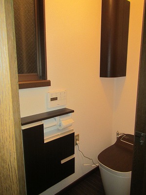 全て取り替えました。茶色で統一し、トイレットペーパーが収納できるように戸棚を設けました。