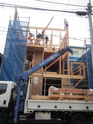 また前面道路は一方通行だったので現場に搬入する材料(柱・梁・パネル・断熱材など)の搬入車両が混同してしまうので、車両を入れるタイミングを計りながら作業を行いました。