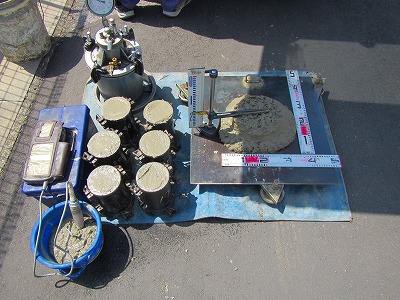 施工時にテストピースを採取し(左上)生コンが規定の強度に達しているか強度検査を行います。