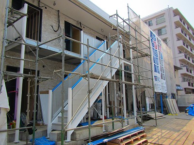 2015/08/05 《鉄骨階段設置編》 松戸の物件の進捗状況! 464号線沿いの2階建て木造住宅の 物件ですが、本日鉄骨階段の設置工事が 行われました! 外壁工事・屋根工事が終わり、足場の組替えを してから鉄骨階段を取付しました。 鉄骨階段の柱の根元は基礎工事の時に 箱抜きをして根入れ深さを確保しました。 工事期間は2日間!! 今週の土曜日には足場もすべて外れるので 外観を見ることができます。 ぜひ6号線から464号線に入り約200m進むと 右側にありますので、ぜひ見に来てください♪ クニックホームズ 大羅
